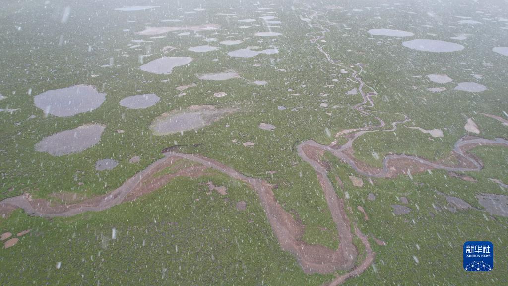 風(fēng)雪彌漫中的當曲濕地(7月24日攝,無(wú)人機照片)。