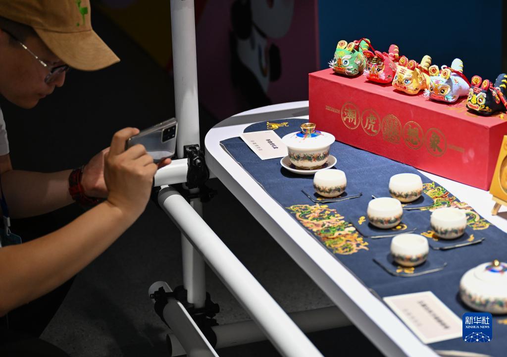 7月26日,觀(guān)眾在世界大學(xué)生運動(dòng)員人文交流活動(dòng)啟動(dòng)儀式上拍攝文創(chuàng )產(chǎn)品。