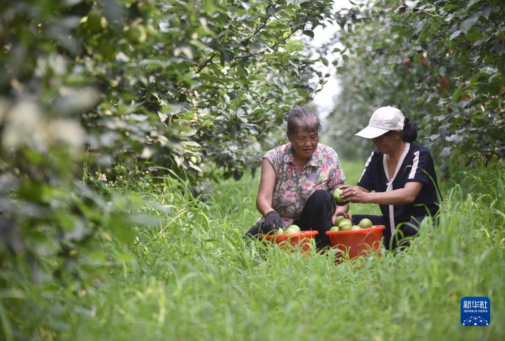 7月27日,河北省威縣張營(yíng)鄉前花疃村果農在梨園分揀采摘的梨果。