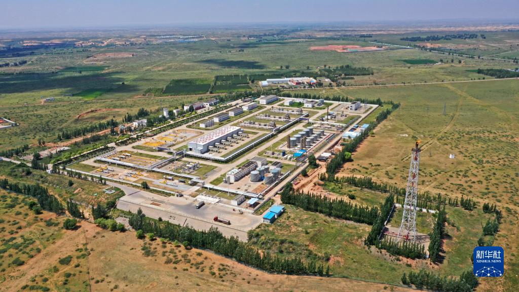 長(cháng)慶油田第五采氣廠(chǎng)蘇里格天然氣第二處理廠(chǎng)周邊綠意盎然(7月25日攝,無(wú)人機照片)。