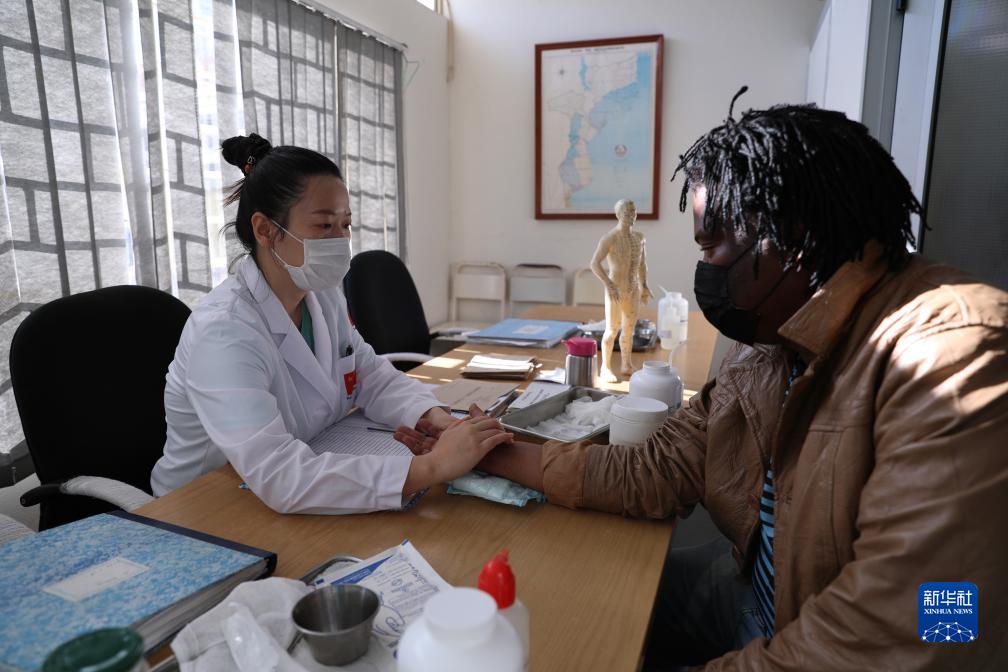 7月27日,在莫桑比克首都馬普托的馬普托中心醫院,中國醫療隊中醫針灸科醫生周敏為病人看病。
