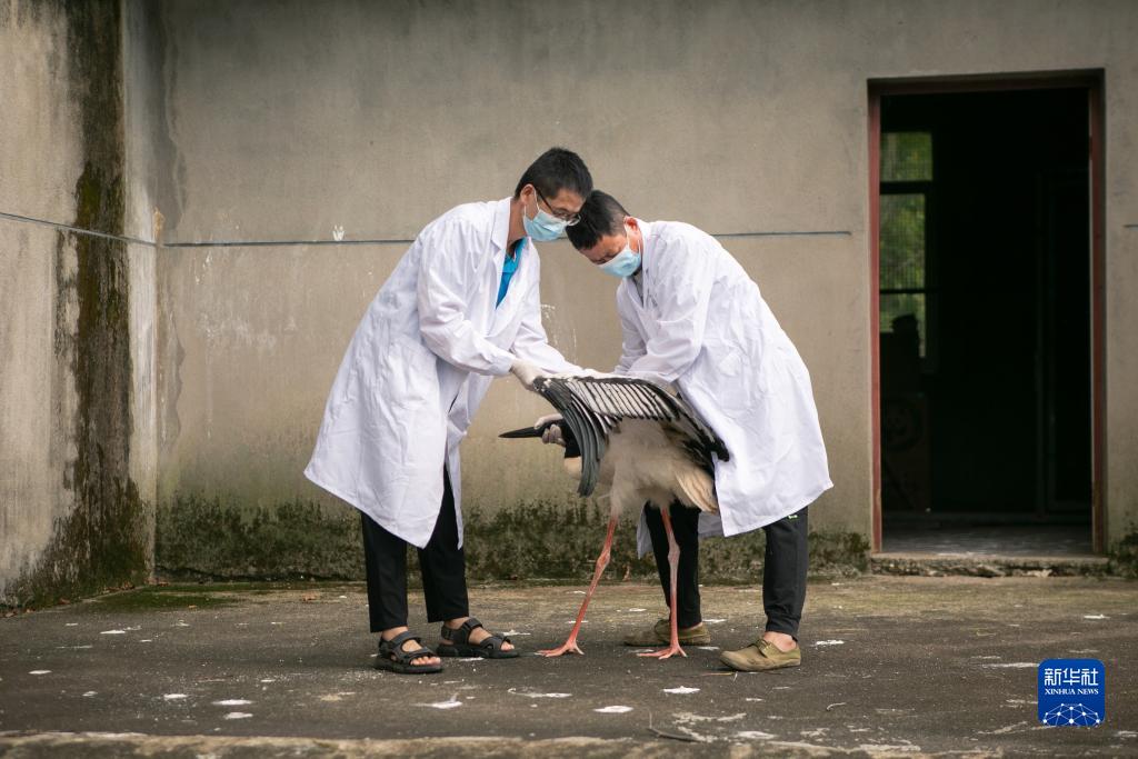 在江西省野生動(dòng)物救護中心,工作人員在檢查東方白鸛的翅膀受傷情況(7月16日攝)。