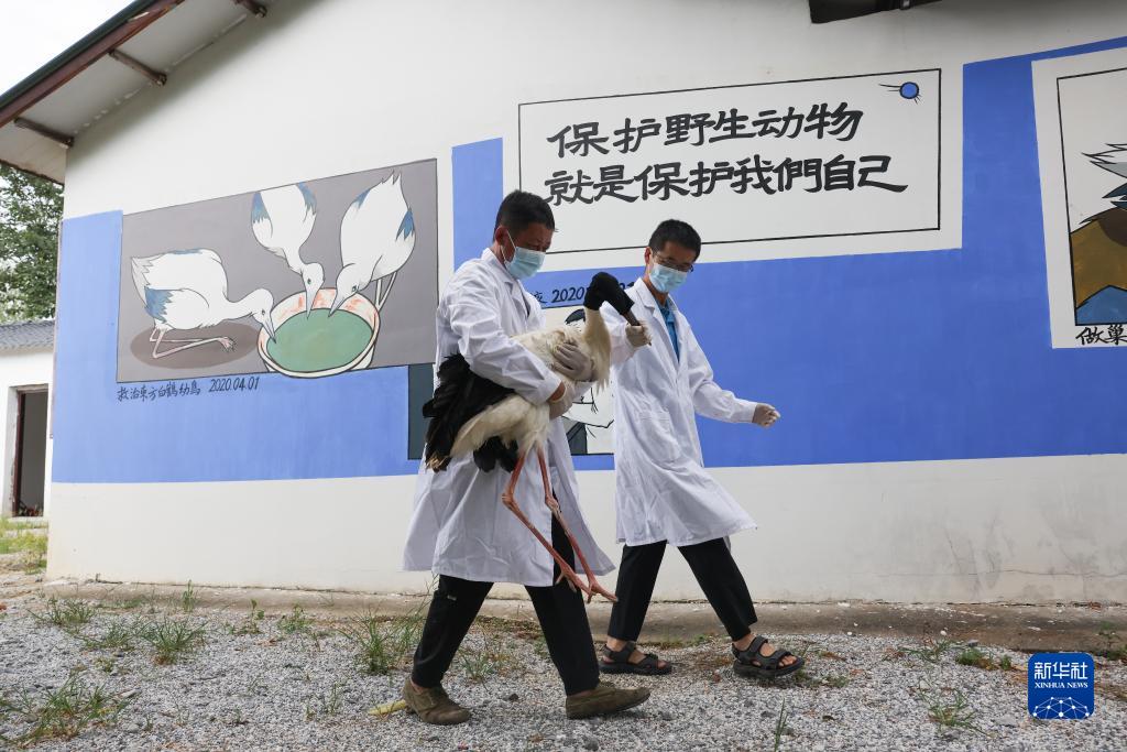 在江西省野生動(dòng)物救護中心,工作人員將體檢完畢的東方白鸛送回(7月16日攝)。