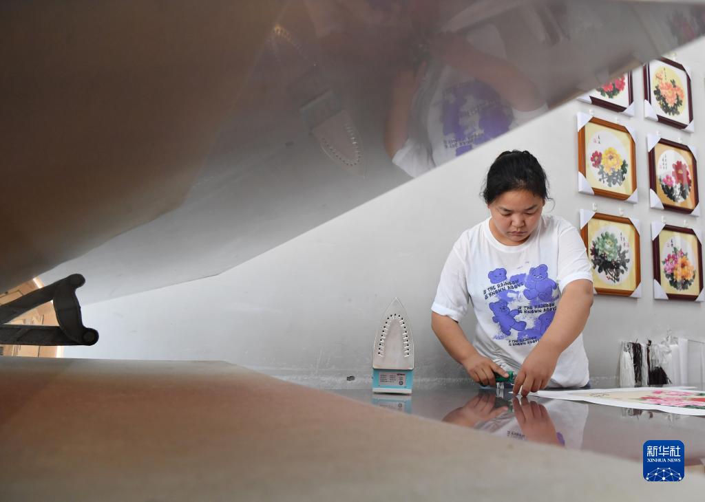 7月26日,工作人員在平樂(lè )社區的牡丹畫(huà)創(chuàng )意產(chǎn)業(yè)園區工作室內裝裱牡丹畫(huà)。