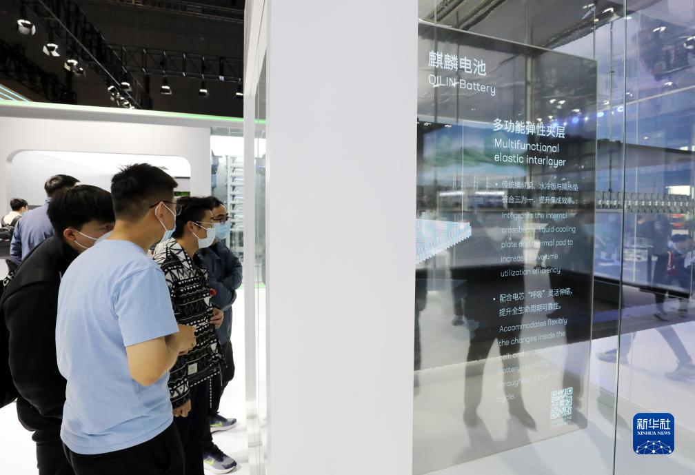 2023年4月24日,在第二十屆上海車(chē)展上,參觀(guān)者在寧德時(shí)代麒麟電池展示模型前交流討論。