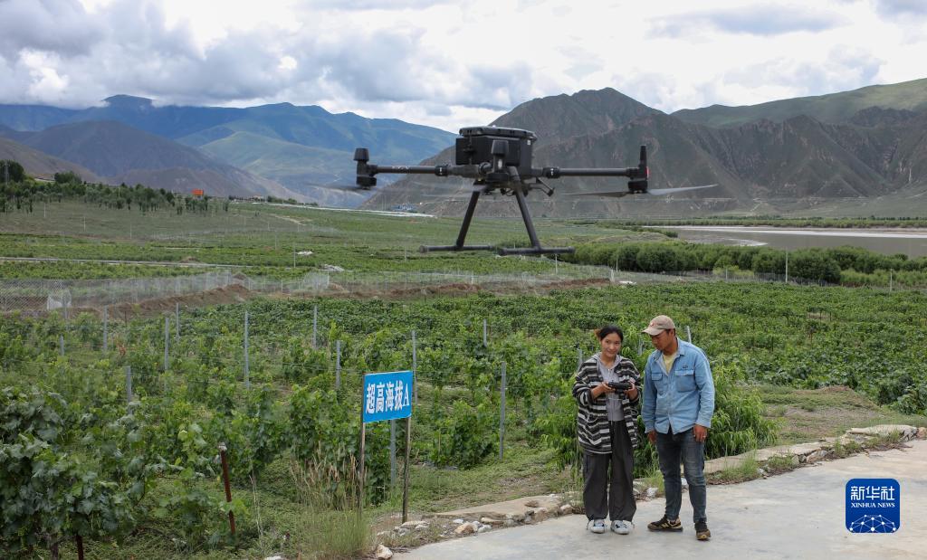 7月26日,桑日縣一家葡萄酒企業(yè)的員工曲珍(左)在葡萄園里向技術(shù)員何志榮學(xué)習使用農用無(wú)人機。