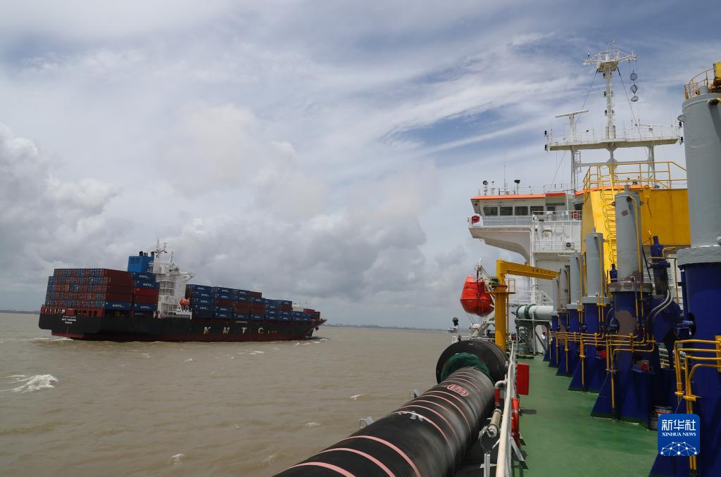 7月26日,在長(cháng)江口航道,一艘滿(mǎn)載集裝箱的貨輪從中交上航局耙吸式疏浚挖泥船“新海鳳”輪旁駛過(guò)。