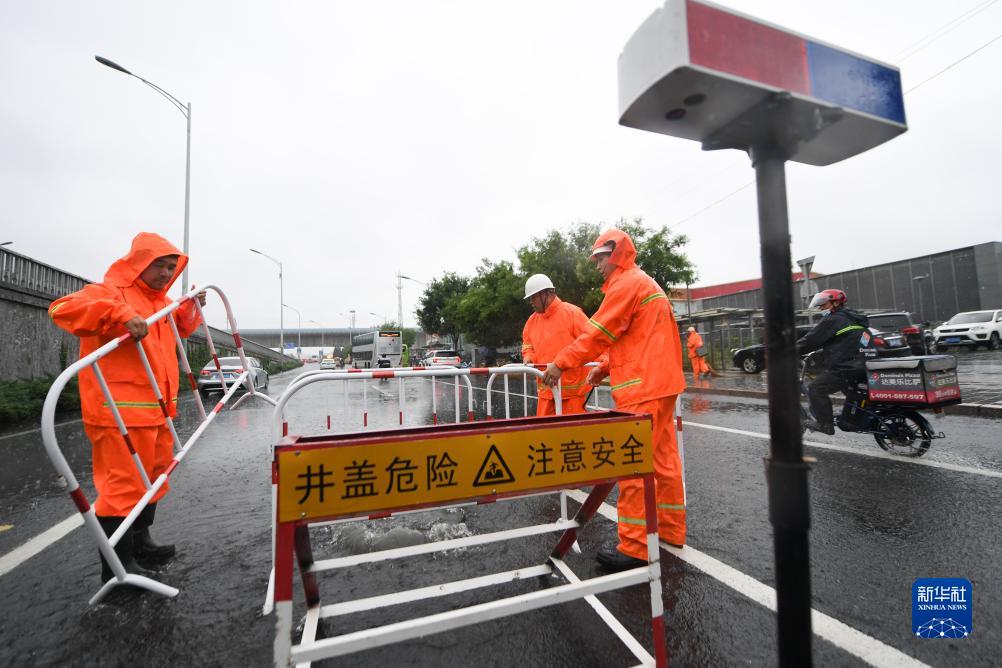 7月30日,在北京市朝陽(yáng)區十里河橋附近,北京排水集團的工作人員在設置警示裝置。