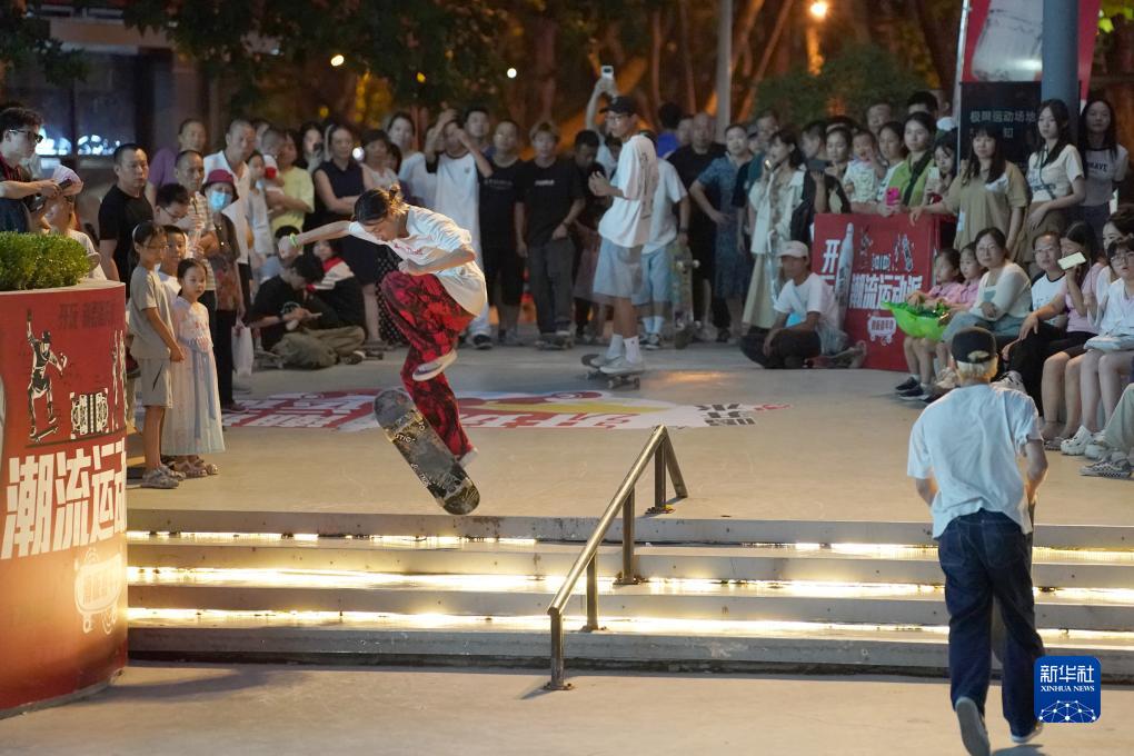7月30日,滑板愛(ài)好者在西安市一商業(yè)街區進(jìn)行滑板表演有獎競賽活動(dòng)。