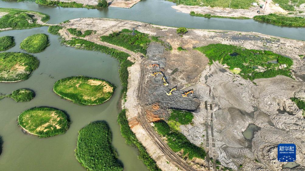 7月31日,在德清縣康乾街道金鵝湖濕地公園施工現場(chǎng),挖掘機在進(jìn)行土方開(kāi)挖工程作業(yè)(無(wú)人機照片)。