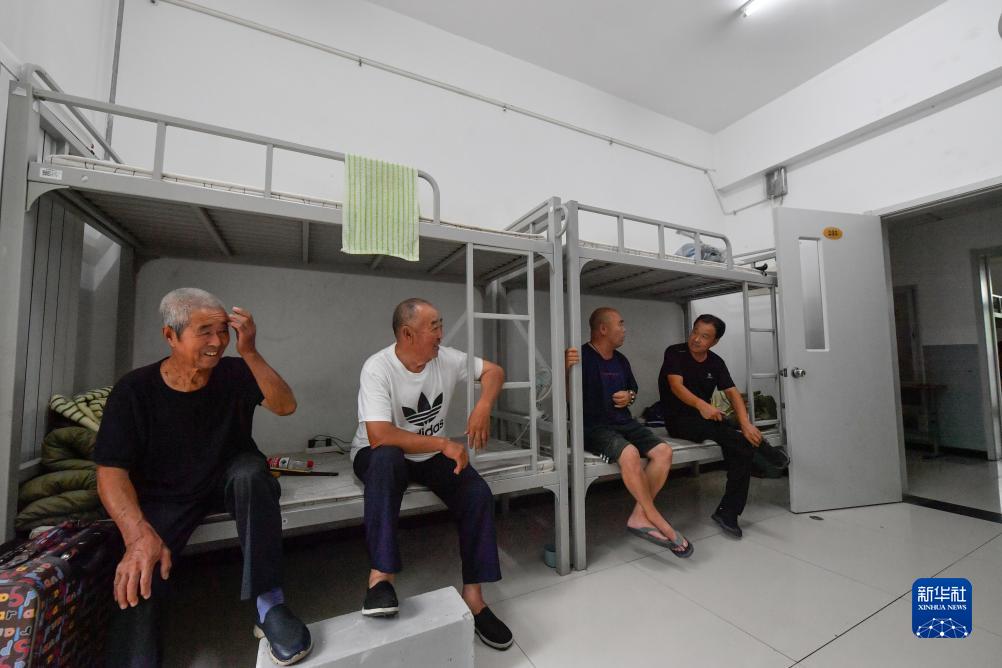 8月1日,在天津市武清區職業(yè)教育中心臨時(shí)安置點(diǎn),轉移人員在房間內交談。