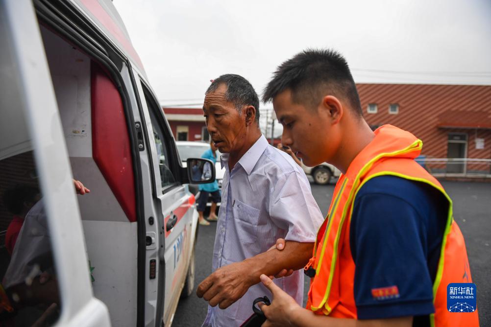 8月1日,在北京市門(mén)頭溝區妙峰山鎮妙峰山民族學(xué)校臨時(shí)安置點(diǎn),門(mén)頭溝區消防救援支隊的消防員攙扶一名傷者登上救護車(chē)。