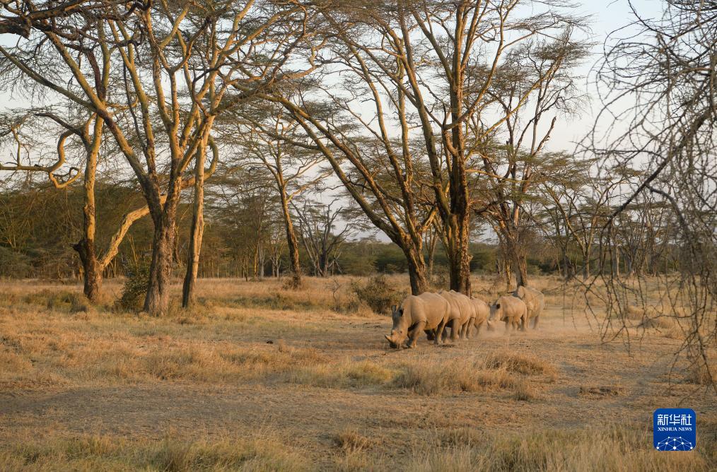 這是2月12日傍晚,犀牛在肯尼亞納庫魯湖國家公園內活動(dòng)。