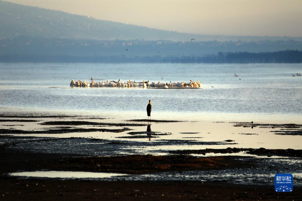 這是2022年5月13日在肯尼亞納庫魯湖國家公園拍攝的非洲禿鸛(前)和鵜鶘。