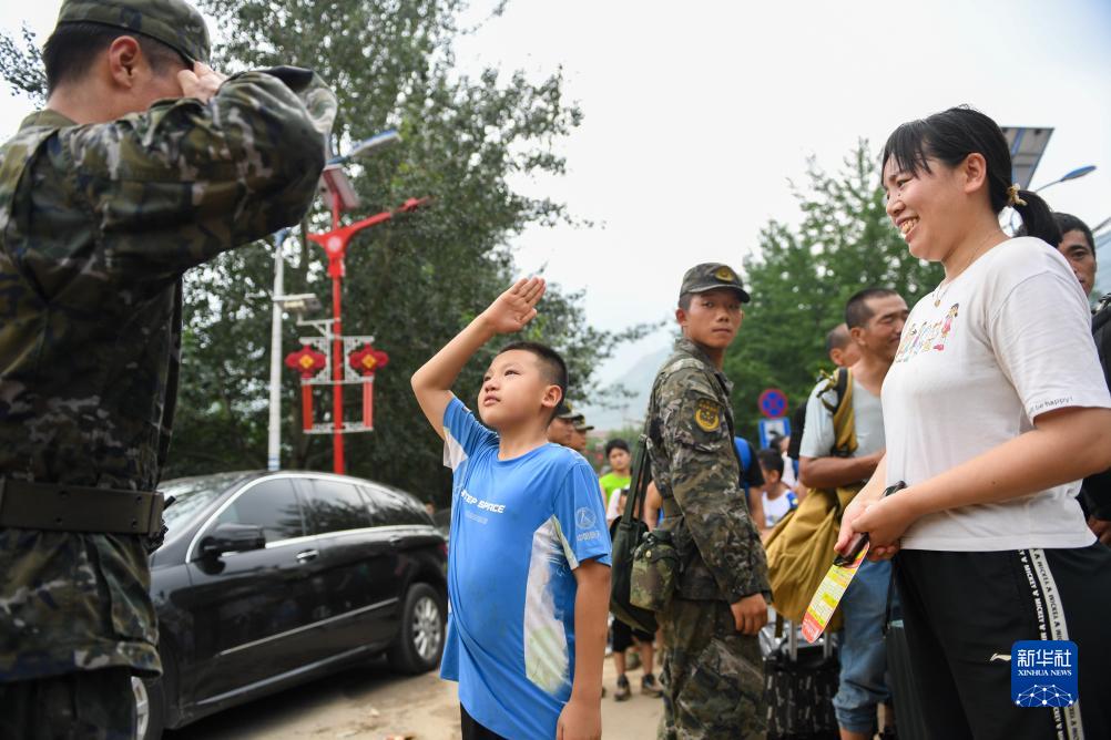 8月2日,在北京市門(mén)頭溝區妙峰山鎮,在乘坐車(chē)輛轉移前,武天騏(中)向武警北京總隊機動(dòng)三支隊的王雷鳴敬禮感謝。