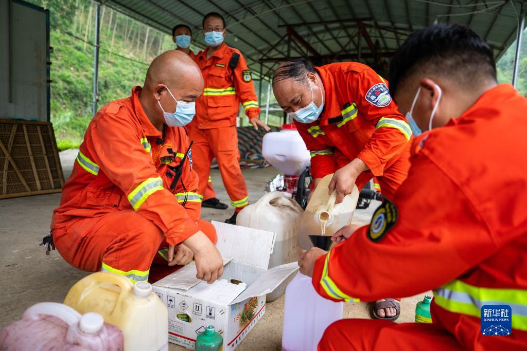 8月2日,在桃江縣桃花江國有林場(chǎng),護林員在準備治理竹蝗的藥水。