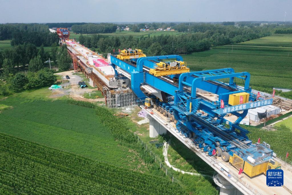 8月2日,架橋機在菏蘭高鐵蘭考特大橋上進(jìn)行箱梁架設作業(yè)(無(wú)人機照片)。