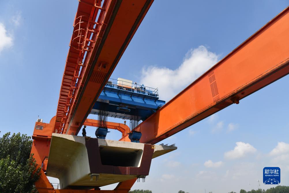8月2日,架橋機在菏蘭高鐵蘭考特大橋上進(jìn)行箱梁架設作業(yè)。