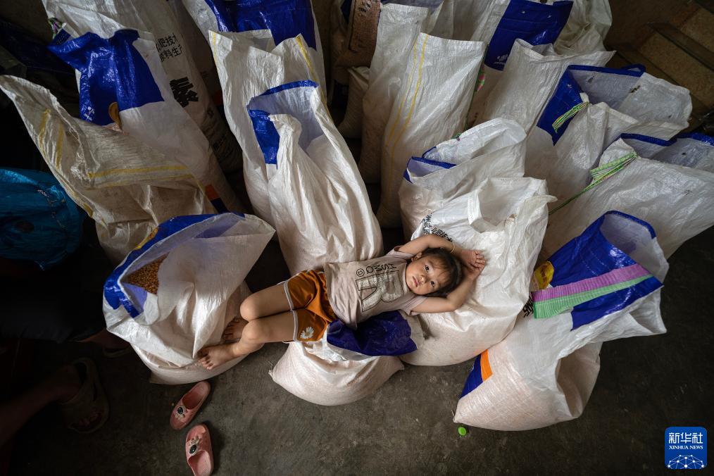 7月31日,吳世榮的女兒在家中的玉米堆上玩耍。新華社記者費茂華攝