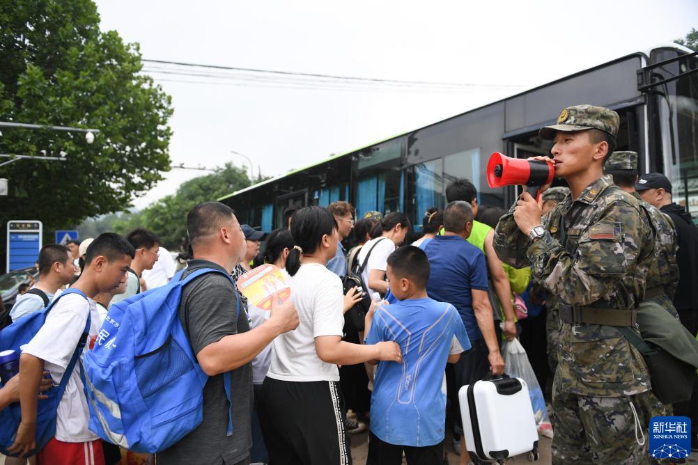 8月2日,在北京市門(mén)頭溝區妙峰山鎮政府附近,武警北京總隊機動(dòng)三支隊官兵引導旅客排隊乘坐大巴車(chē)轉移。