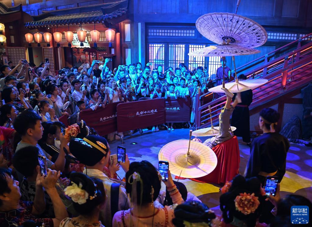 8月2日,游客在長(cháng)安十二時(shí)辰主題街區觀(guān)看唐風(fēng)演藝《長(cháng)安百藝》。