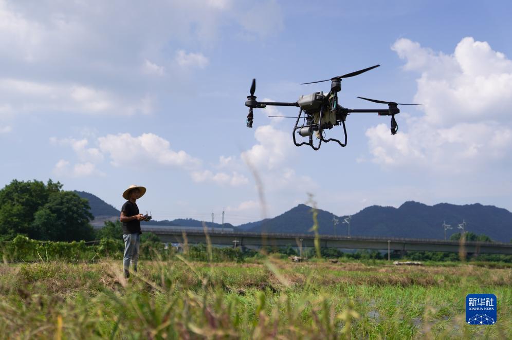江西省新余市分宜縣的農戶(hù)操作無(wú)人機噴灑葉面肥(8月3日攝)。