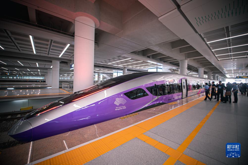 當日,由浙江交通集團購置、為杭州第19屆亞運會(huì )量身定制的復興號亞運智能動(dòng)車(chē)組搭載近百名乘客從杭州西站出發(fā),在合杭高鐵湖杭段開(kāi)啟首次試乘活動(dòng)。復興號亞運智能動(dòng)車(chē)組采用杭州亞運會(huì )主形象色“虹韻紫”涂裝,針對浙江多丘陵山地的地形特點(diǎn)采用定制化的技術(shù)創(chuàng )新方案,提升了乘客的乘坐舒適度,將在杭州亞運會(huì )賽事期間承擔重要的交通轉運功能。