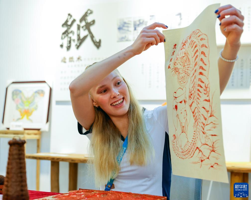 8月3日,在成都大運村的互動(dòng)體驗中心,芬蘭運動(dòng)員杰茜卡·卡哈拉展示自己制作的夾江年畫(huà)。