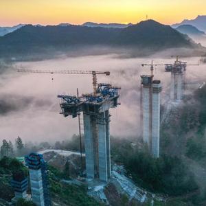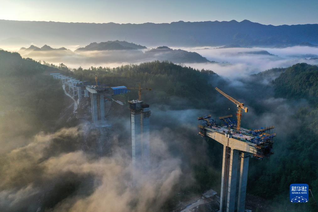 8月4日在湖南省湘西土家族苗族自治州龍山縣拍攝的桑龍高速公路灣檔河特大橋施工現場(chǎng)(無(wú)人機照片)。