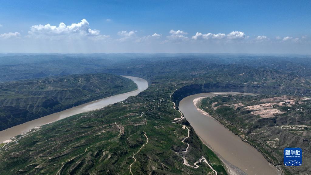 在山西省石樓縣辛關(guān)鎮拍攝的黃河奇灣(8月3日攝,無(wú)人機照片)。
