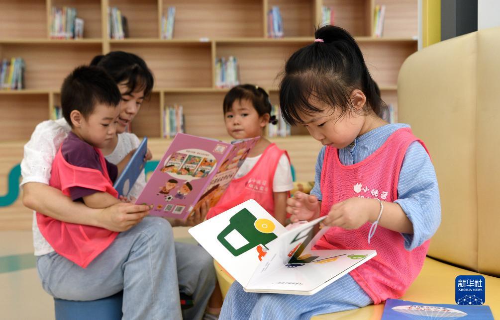在陜西省圖書(shū)館高新館區,一家幼兒園的老師帶領(lǐng)孩子一起閱讀繪本(8月4日攝)。