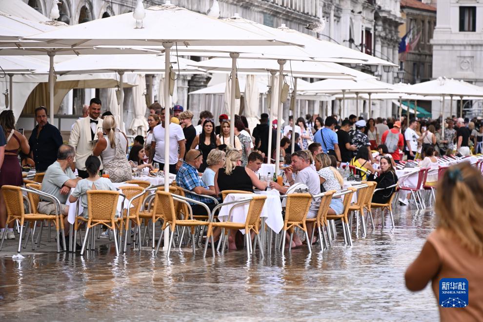 8月4日,游客聚集在意大利威尼斯積水的圣馬可廣場(chǎng)。