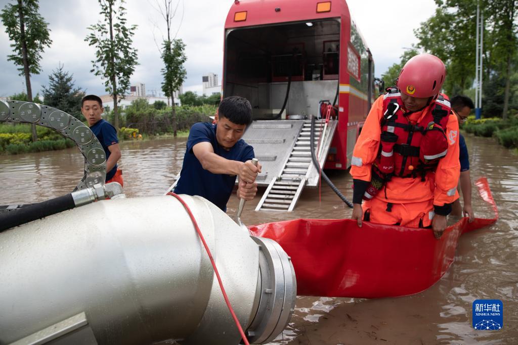 8月5日,在牡丹江市東安區大灣村附近,牡丹江市消防救援支隊的消防員在安裝排澇機器。