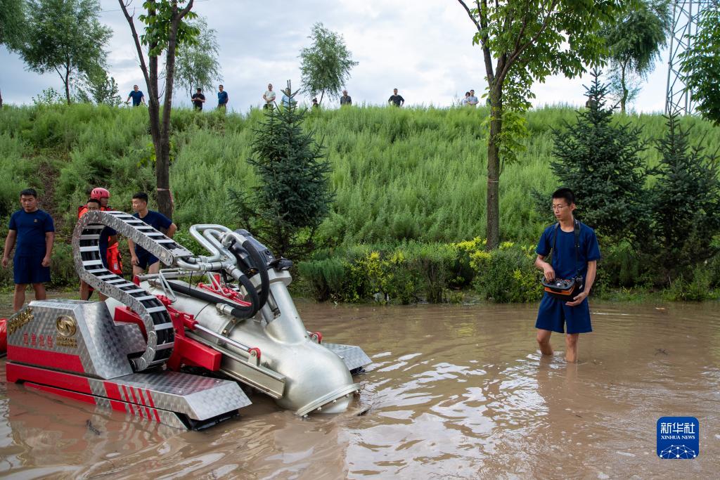 8月5日,在牡丹江市東安區大灣村附近,牡丹江市消防救援支隊的消防員操控機器進(jìn)行排澇。
