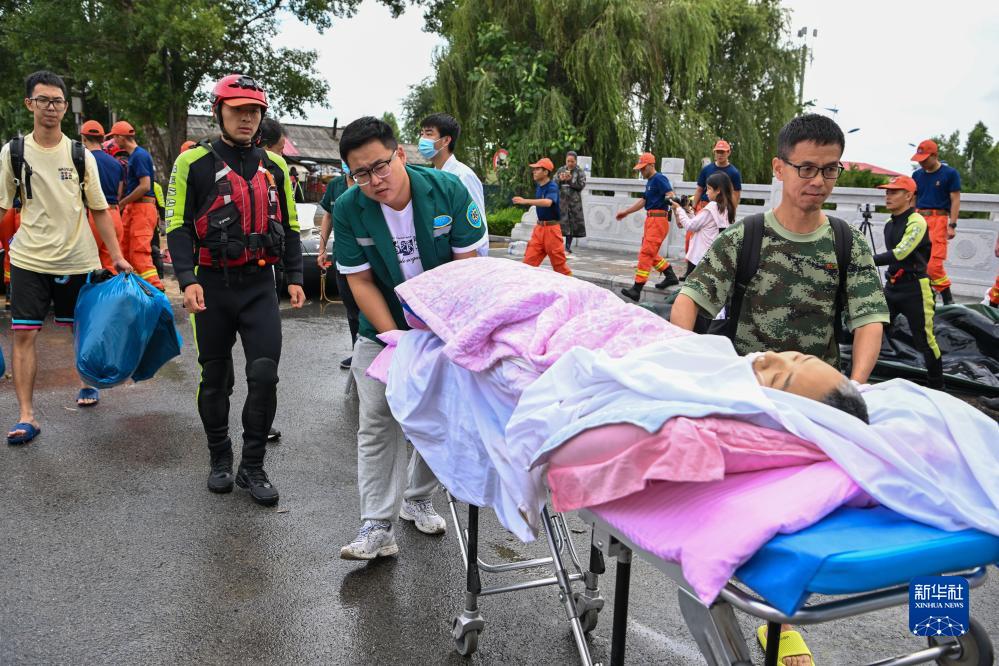 8月5日,急救人員和哈爾濱森林消防支隊戰士在黑龍江省哈爾濱市延壽縣轉移病人。