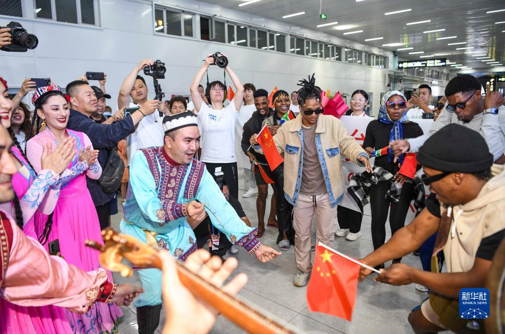 在烏魯木齊地窩堡國際機場(chǎng),新疆藝術(shù)劇院木卡姆藝術(shù)團的演員盛情起舞,歡迎抵達的南非舞蹈演員(7月24日攝)。