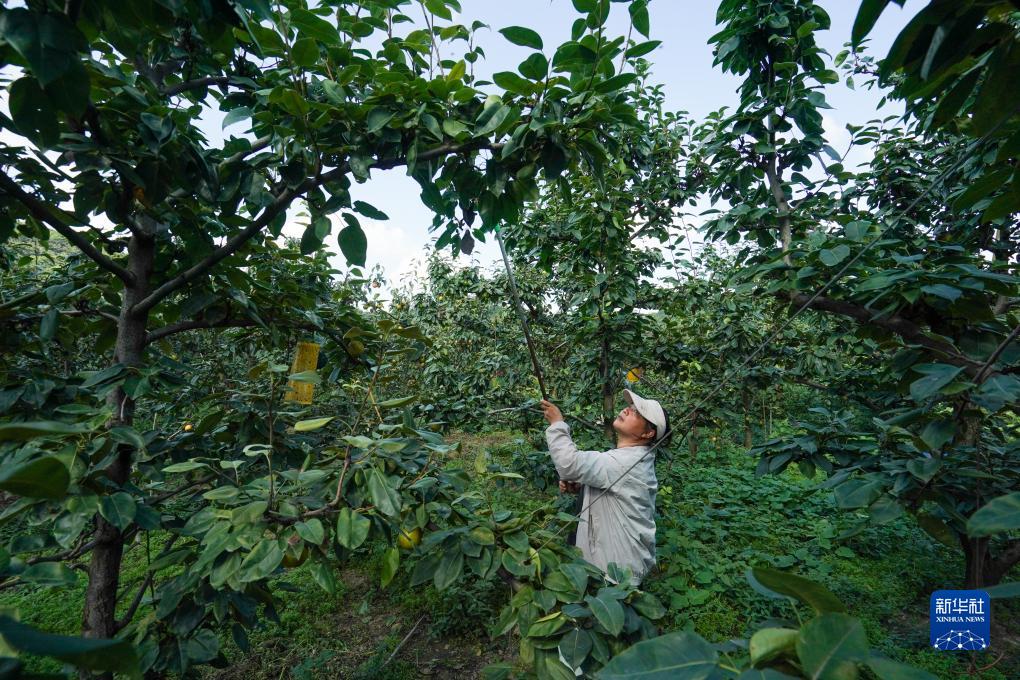農戶(hù)在蘇州市樹(shù)山村梨園內采摘翠冠梨(8月3日攝)。
