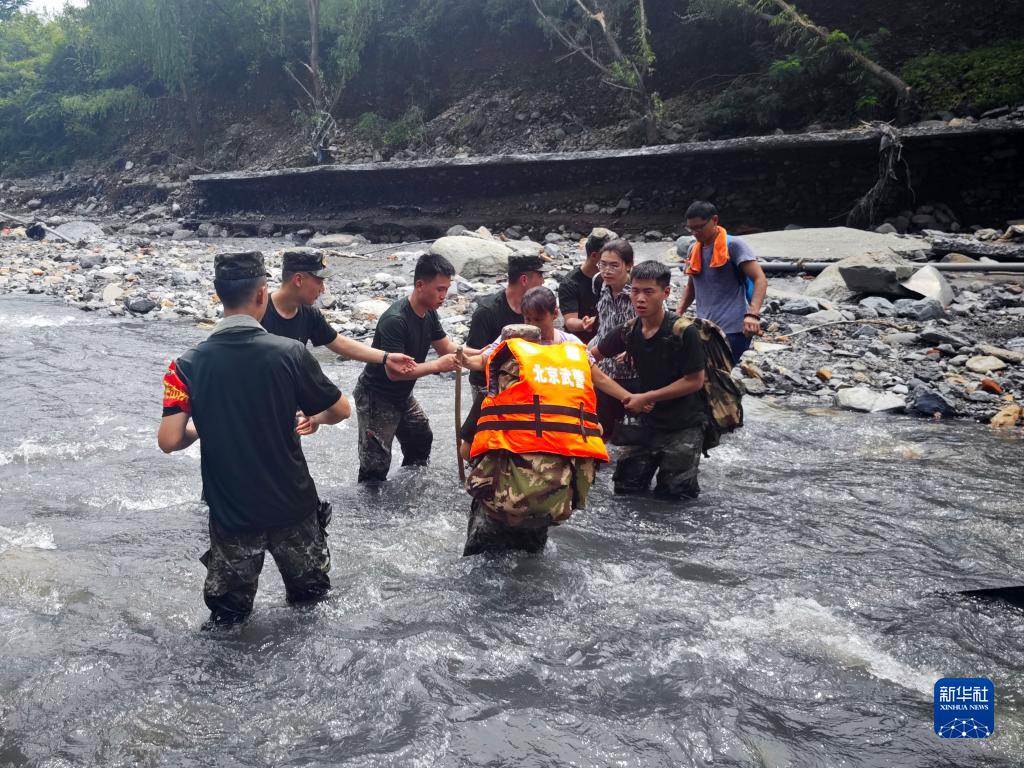 武警北京總隊機動(dòng)第二支隊官兵在北京市房山區史家營(yíng)鄉楊林水村轉移受災群眾(8月4日攝)。新華社發(fā)(楊洋 攝)