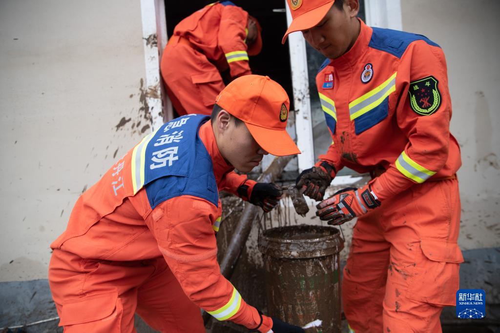 8月6日,在大海林林業(yè)局有限公司自來(lái)水供應站,消防救援人員在清理淤積。