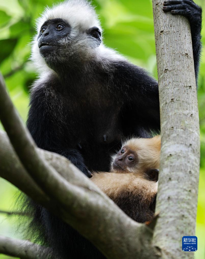 一只白頭葉猴抱著(zhù)幼猴覓食(8月4日攝)。