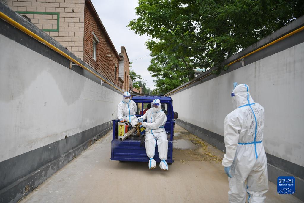 8月6日,在河北省涿州市刁窩鎮白塔村,防疫人員在進(jìn)行道路消殺作業(yè)。