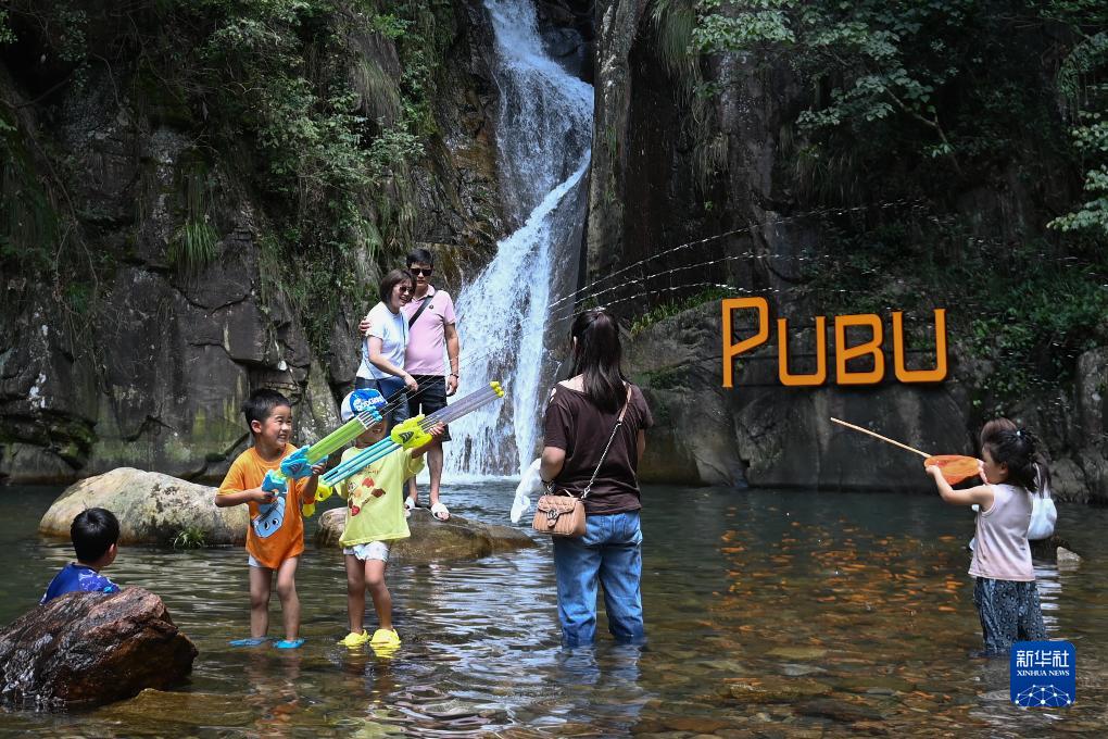 8月6日,小朋友在浙江省安吉縣山川鄉云下飛瀑休閑營(yíng)地戲水。