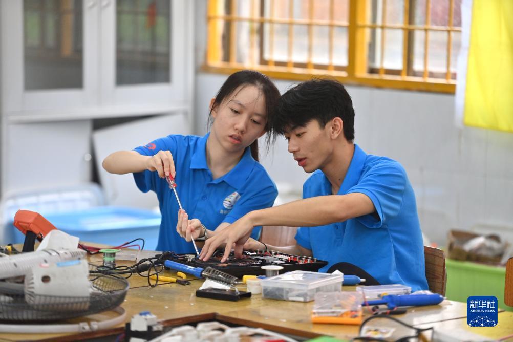 在廣西融安縣泗頂鎮中心小學(xué),廣西科技大學(xué)學(xué)生黃棟愉(左)和同學(xué)在給附近村民維修家電(7月18日攝)。