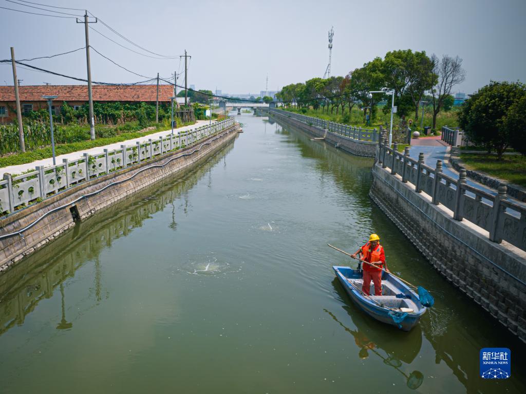 工作人員駕駛小船在寧波市江北區西大河上清理水面(8月11日攝,無(wú)人機照片)。近年來(lái),寧波市江北區通過(guò)堤岸整治、河道清淤、建立微循環(huán)系統等方式,提高了西大河的水體自?xún)裟芰退鷳B(tài)環(huán)境。