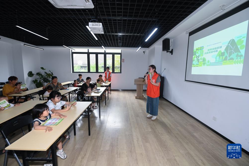 8月15日,在織里鎮港西村文化禮堂內,黨員志愿者給孩子們普及生態(tài)保護知識。