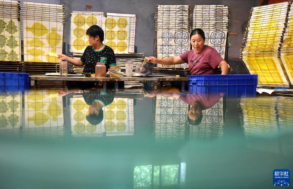 8月15日,在山東省淄博市沂源縣悅莊鎮東埠村一玻璃制品企業(yè),工人對玻璃進(jìn)行貼畫(huà)加工。