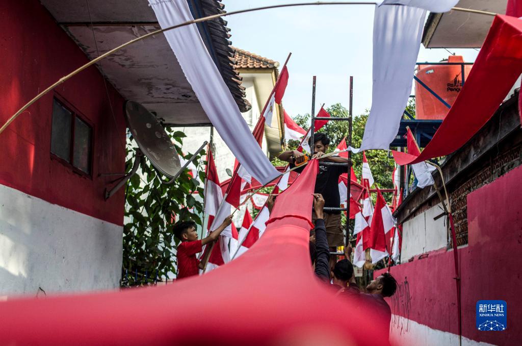 8月14日,在印度尼西亞萬(wàn)隆,人們在居民區布置印尼國旗元素裝飾。