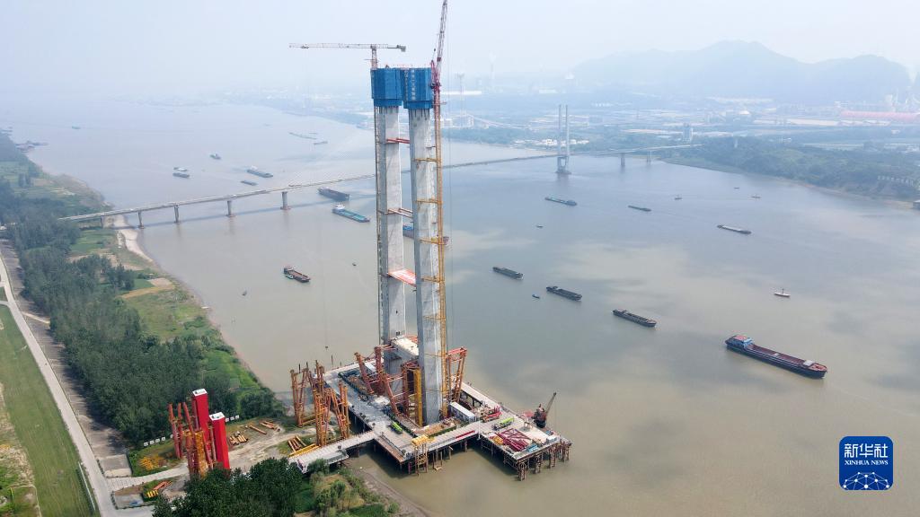 8月18日拍攝的封頂完成的京臺高速銅陵長(cháng)江公鐵大橋3號主塔(無(wú)人機照片)。