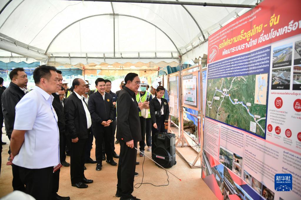 8月17日,泰國總理巴育(中)在沙拉武里府視察中泰鐵路施工段。