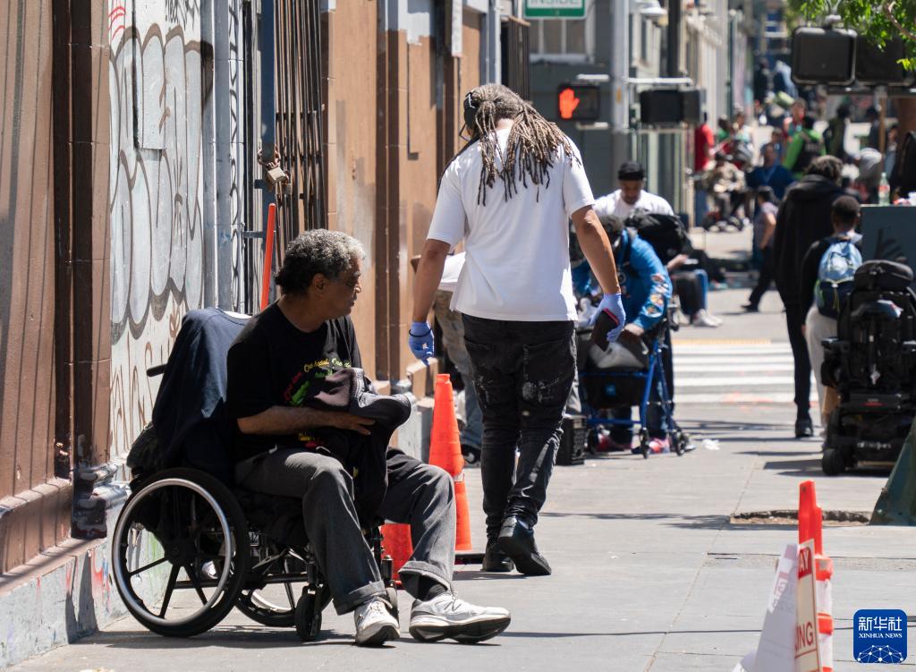 這是8月18日在美國加州舊金山市區的街道上拍攝的無(wú)家可歸者。